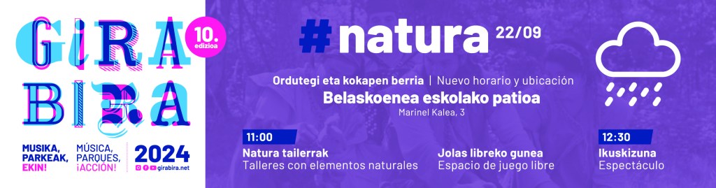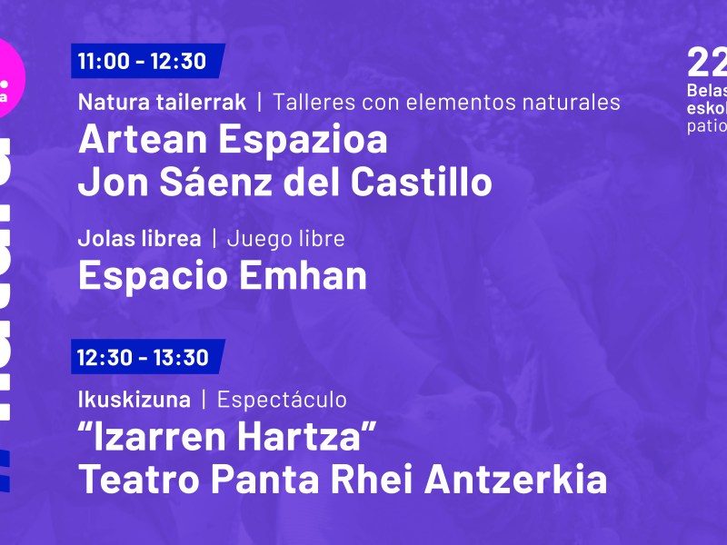Natura tailerrak Artean Espazioa eta Jon Sáenz del Castillo eskutik / Jolas libreko gunea Espacio Emhan eskutik / Talleres con elementos naturales Artean Espazioa y Jon Sáenz del Castillo /Espacio de juego libre con Espacio Emhan - 12:30 – 13:30